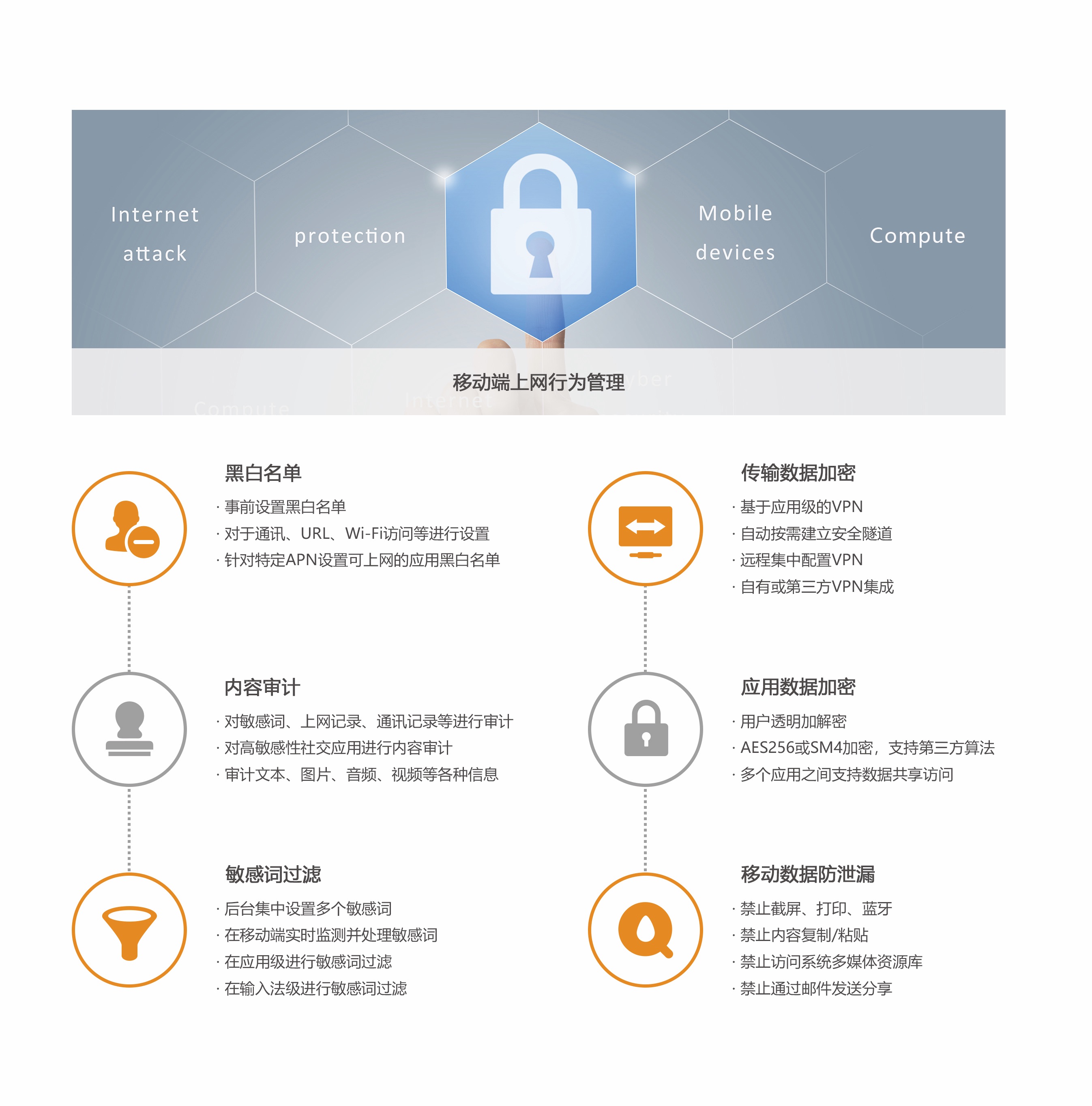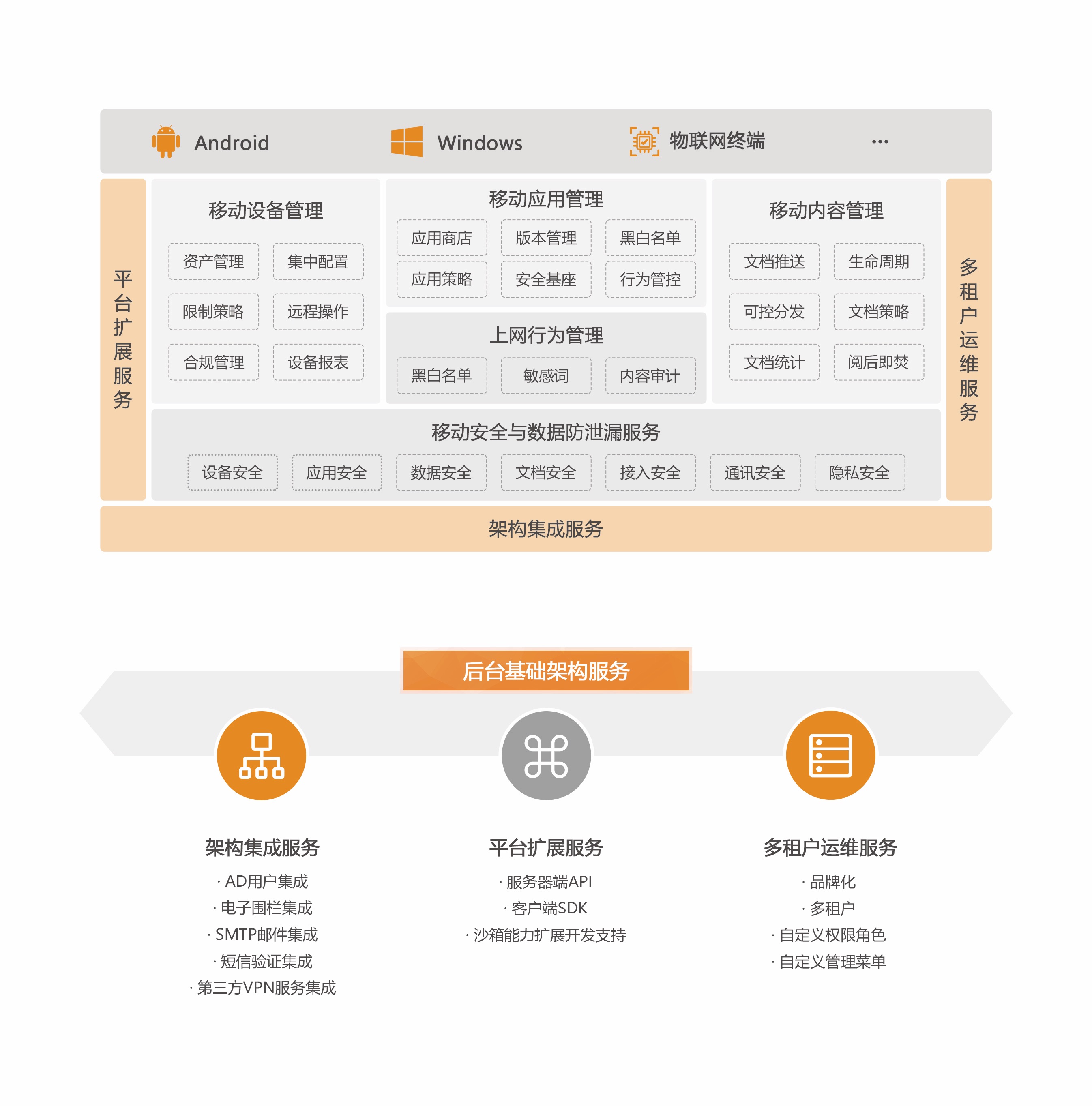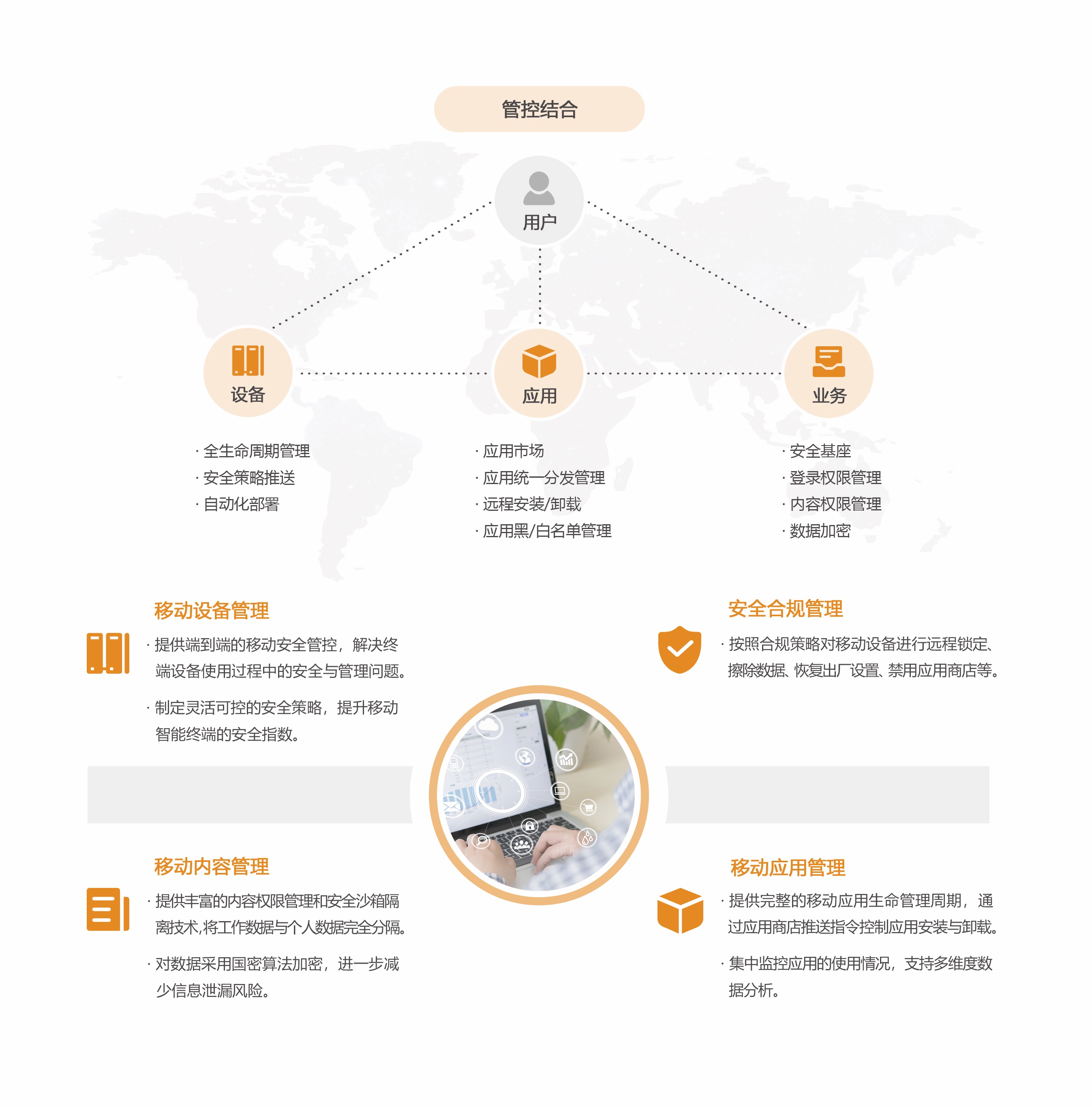 移動安全管理平臺是集移動設備管理、移動應用管理、移動文檔管理、安全合規管理于一體的移動安全管理系統,可從用戶、設備、應用、數據四個維度高效管理移動端的安全風險,是功能完整、能夠快速實施落地的移動安全管理產品。目前,平臺已廣泛應用在公安、司法、應急等多個行業。