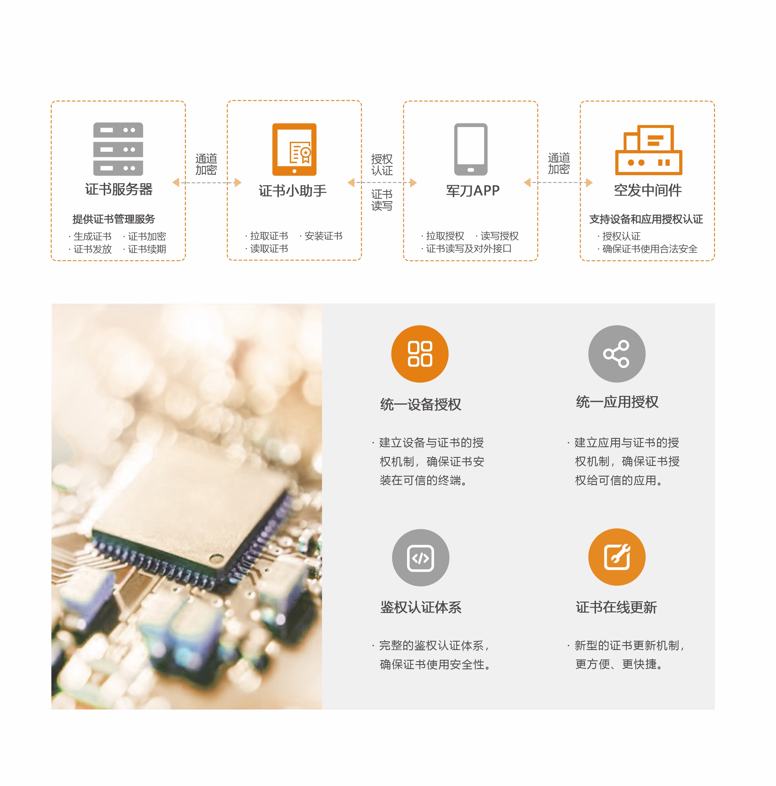 空中發證系統是針對終端設備提供在線證書授權及更新服務的管理系統,采用領先的技術手段,打破原有的線下制證及更新機制,轉變為更加安全、快捷、高效的在線模式,將證書存儲于終端可信芯片區域,保障授權及鑒權流程,增強了證書的安全性,對應用請求者的身份進行認證和校驗,確保發證鑒權服務的安全可信。