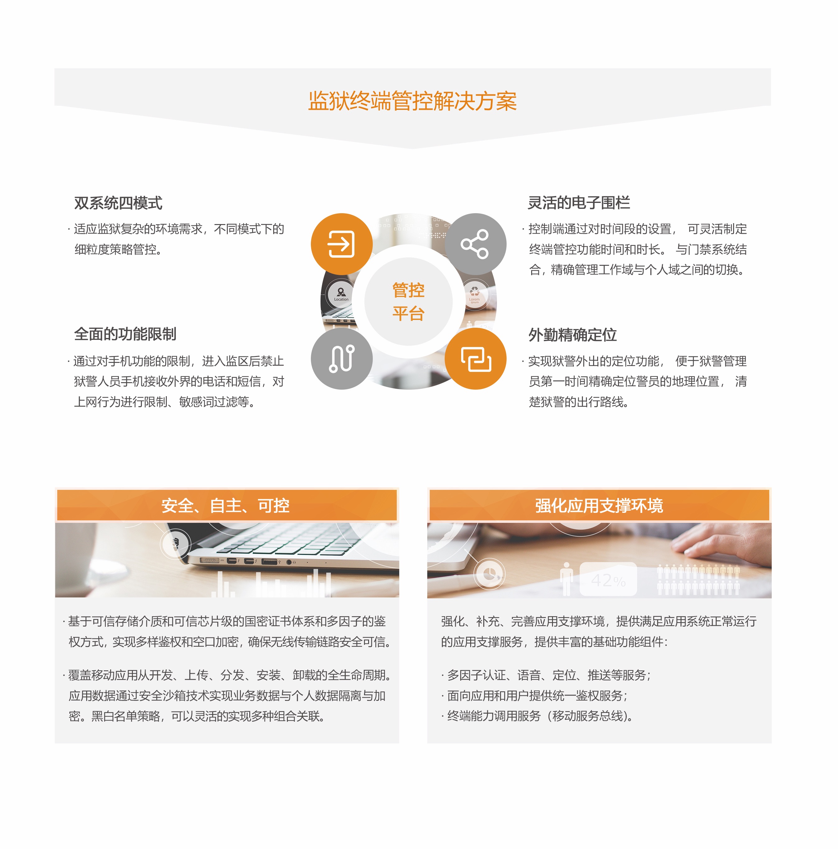 電信易通以司法部《司法行政移動執法系統技術規范》、智慧監獄、智慧戒毒等相關技術規范為依托,為司法行業提供移動執法系統解決方案。其中包括:整體平臺設計搭建、移動執法終端管控、司法移動應用、移動應用支撐體系以及定制雙域四模式安全執法終端等建設內容。